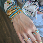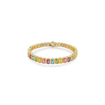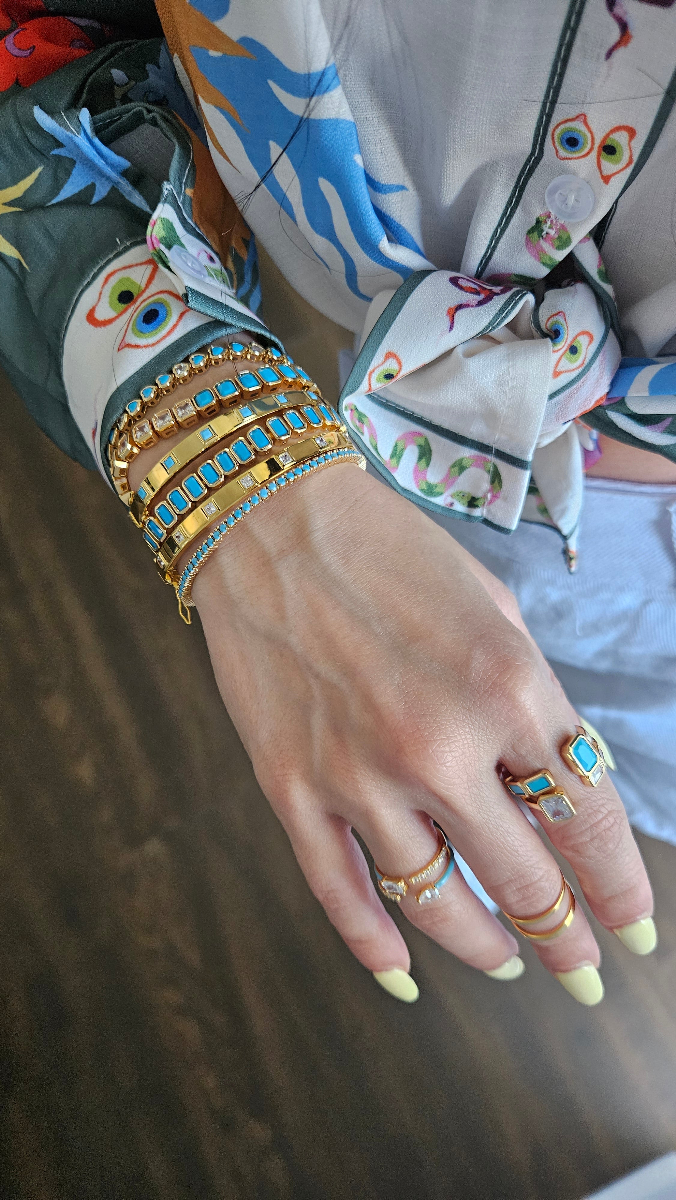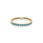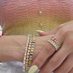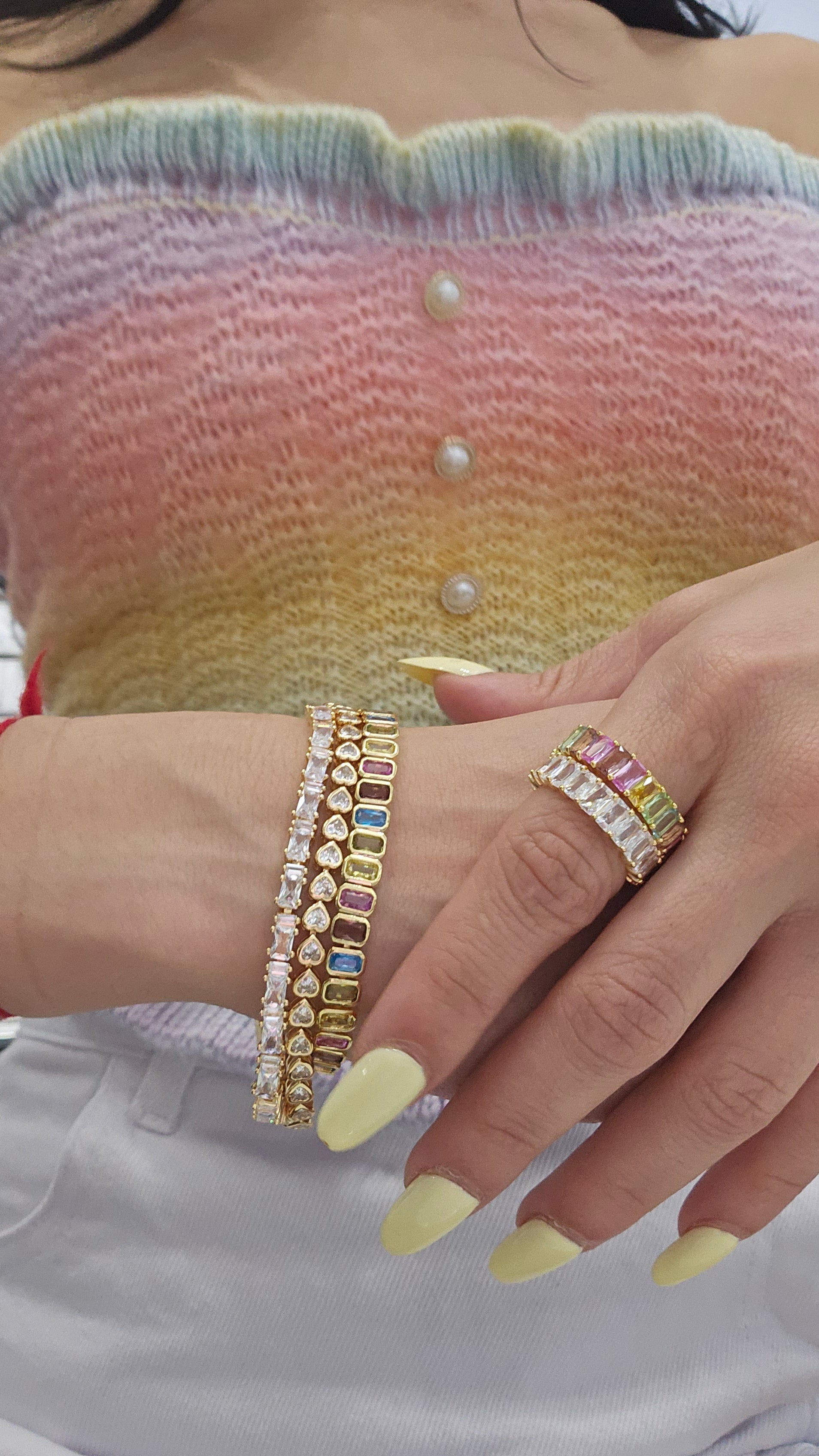 The Baguette Shine Bracelet features rectangular-cut stones set in a classic tennis silhouette, reimagined with vibrant colors and a bold 18K gold finish. Designed for those who love to make a statement, this bracelet pairs sparkle with sophistication. Available in five dazzling shades, it’s the perfect piece to layer or wear solo.