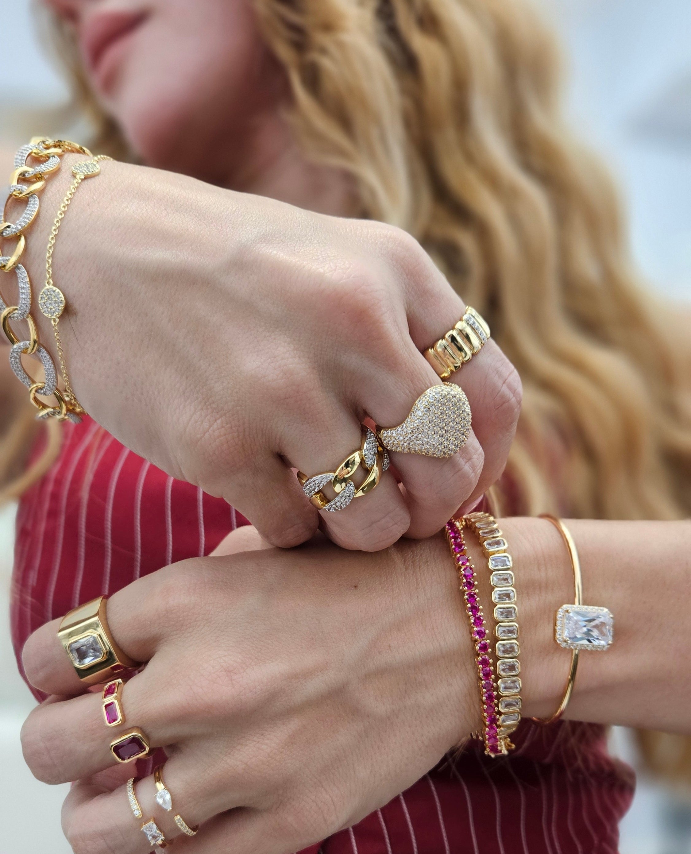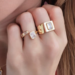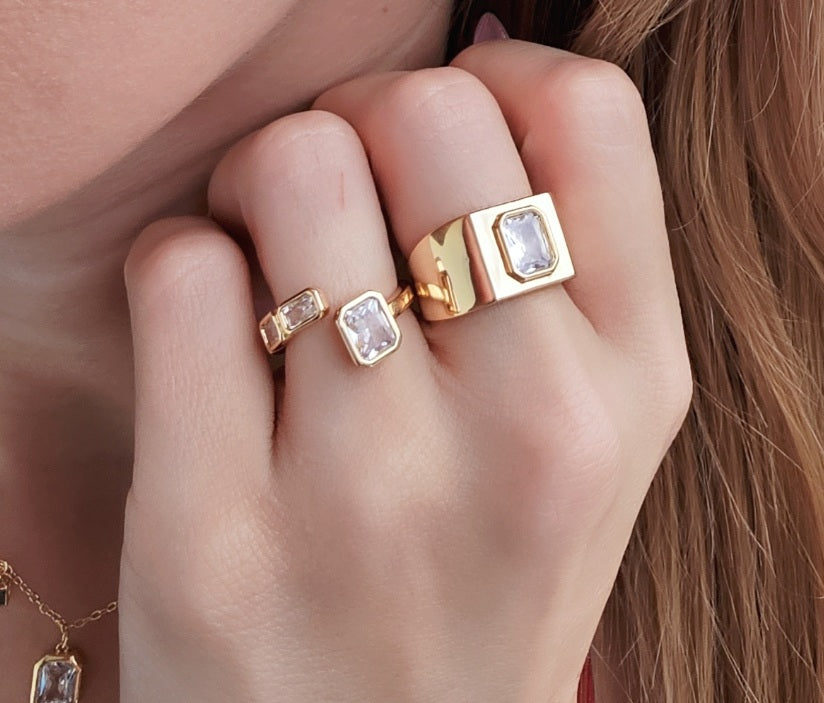 Make a bold statement with the Cleopatra Ring. Its wide band and emerald-cut central stone offer timeless elegance with a touch of modern sophistication. Whether in deep green or classic clear, it's a powerful piece that adds strength and shine to any look.