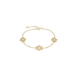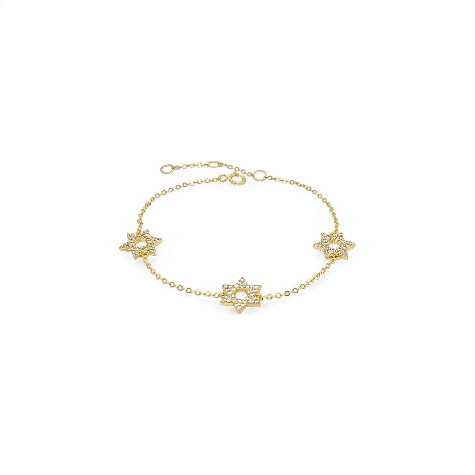 This elegant bracelet features three delicately crafted Stars of David adorned with pavé-set CZ stones, symbolizing protection and timeless style. With a minimalist chain and refined finish, it’s a meaningful accessory that complements both everyday and formal looks.