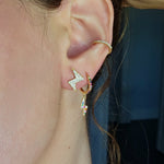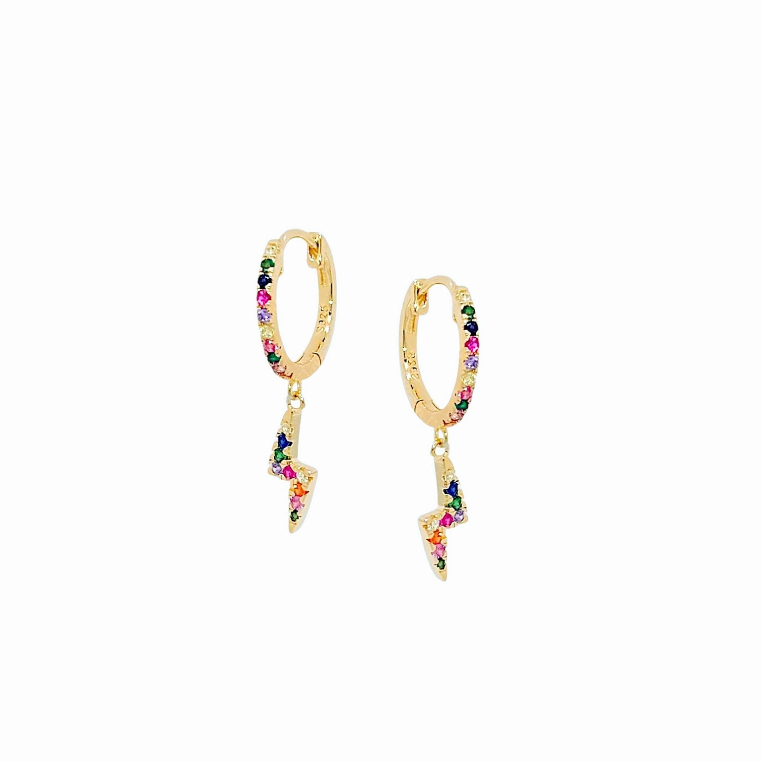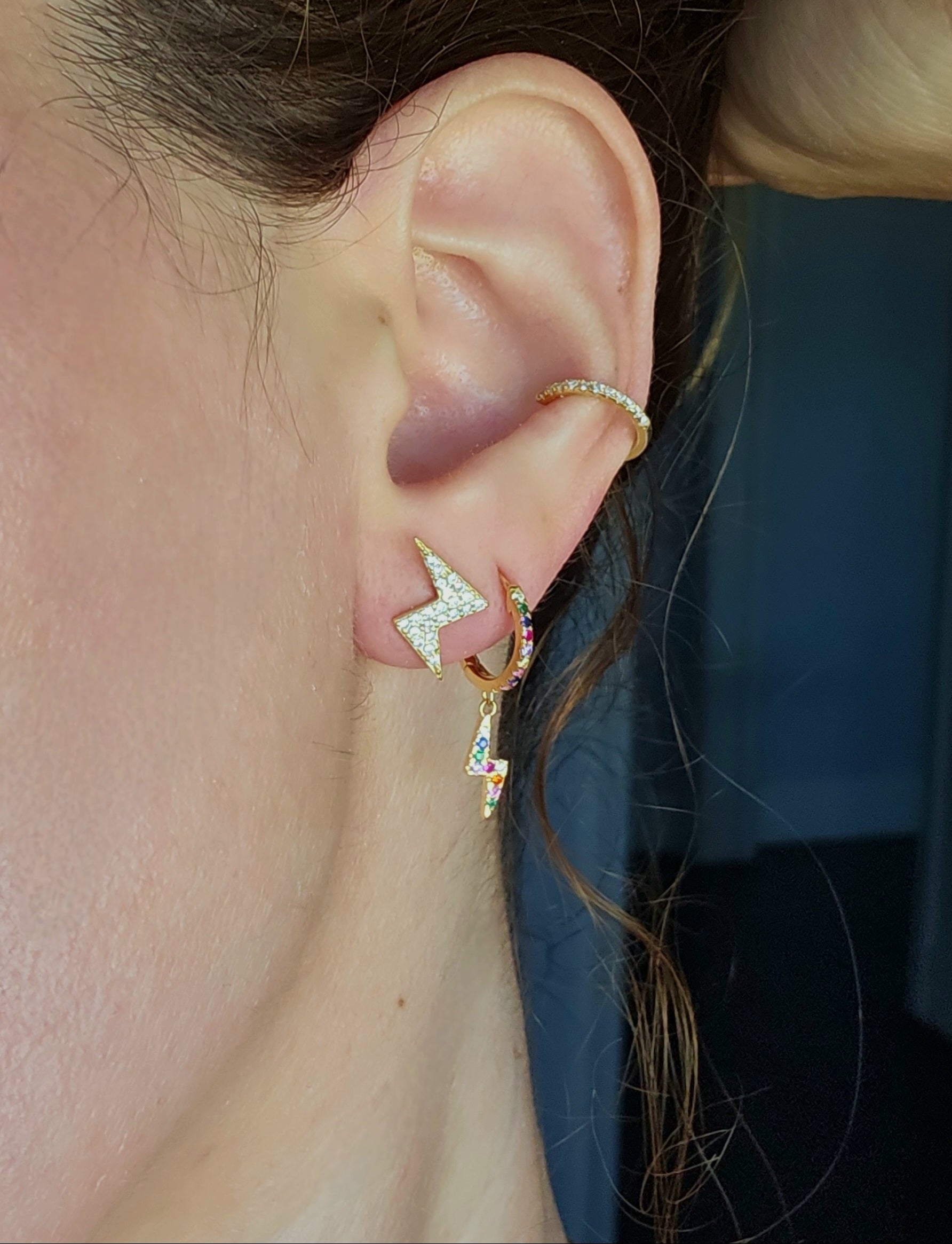 The Rayo Hoop from our HOOPS AND HUGGIES Collection features a sleek hoop paired with a dangling lightning bolt charm, adding a bold and edgy accent to your look. Crafted from 925 sterling silver and finished in 18k gold plating, it’s perfect for stacking or wearing solo for a powerful touch of shine.