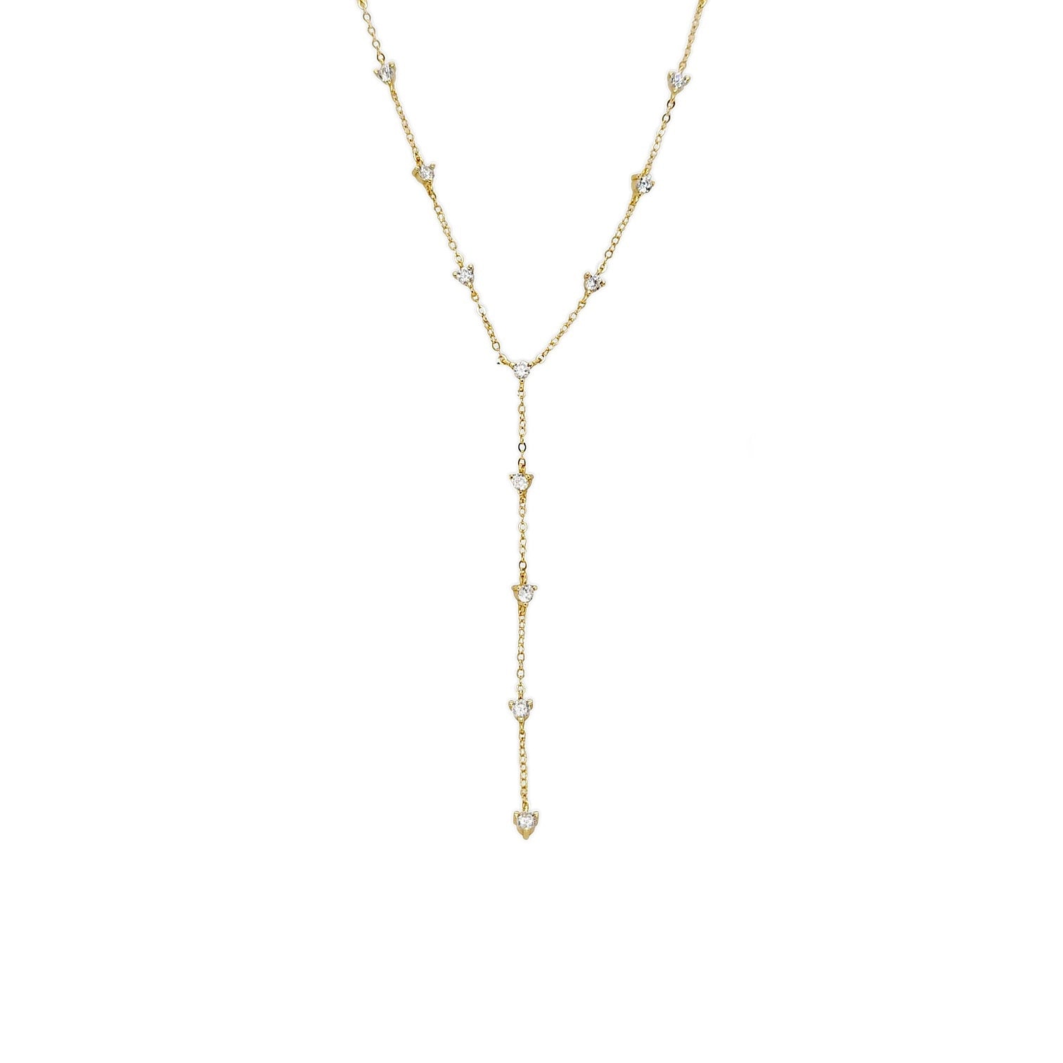 The Sky Lariat from our LARIATS Collection features a minimalist drop design adorned with delicate 5A cubic zirconia stones, evoking the sparkle of a clear night sky. Crafted from 925 sterling silver and finished in 18k gold plating, it’s a versatile piece that adds light and grace to both casual and formal outfits.